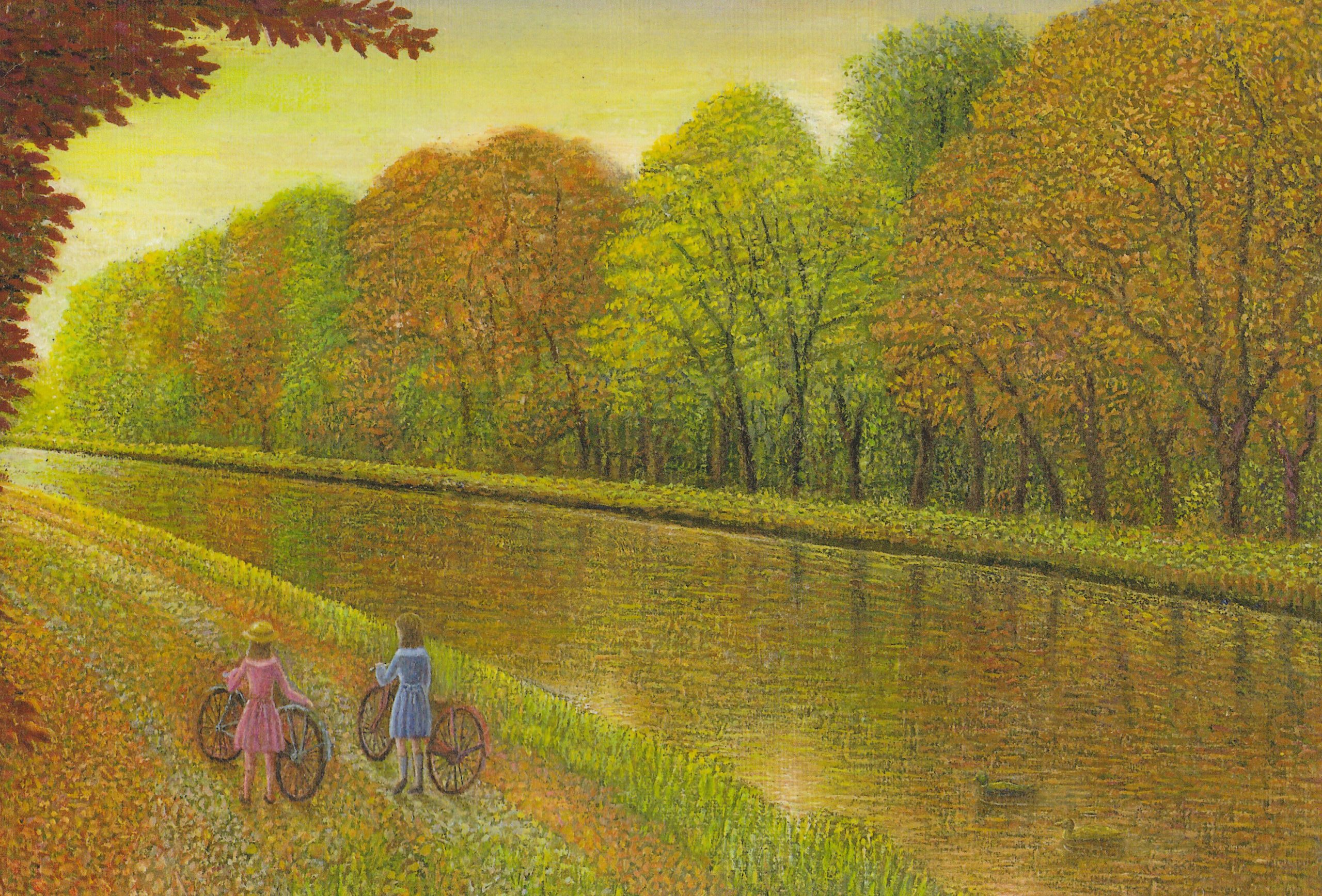 「秋の御影用水」 2025.09.24 中山道の追分宿は標高が1000mの避暑地です。浅間山の地下水を日光で温める人口の用水路(御影用水)は林の中を流れて美しい景観を作っています。紅葉の散歩は素敵です。 カンヴァス・油彩 F4号 2010年