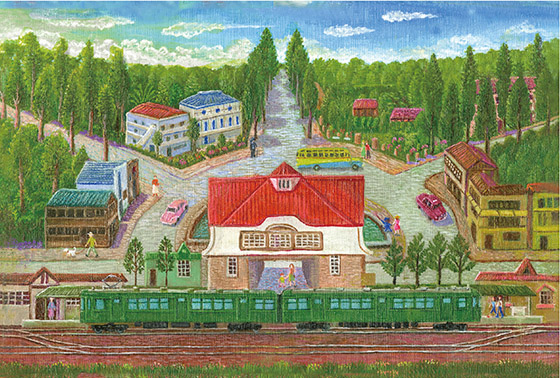古い東急の電車が走る駅の風景です。幼いころに緑の電車が好きでした。東京の浅草に住んでいた私は、カメラを持ってわざわざ乗りに行きました。その時の感動を絵にしました。